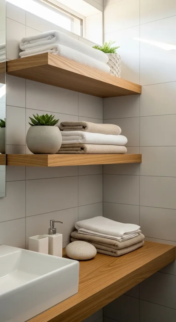 Idea 1: Floating Wooden Towel Shelves Above Sink
