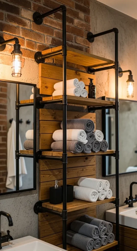 Industrial pipe shelving introduces a bold and functional aesthetic that combines metal piping with wooden boards to create strong towel storage systems. This design is widely used in modern bathroom decor due to its durability and visually striking structure. The exposed metal framework adds character while maintaining practical organization. Towels can be stored in stacked layers or rolled arrangements, making them easy to access. This style is especially effective in bathrooms that follow urban, rustic, or industrial-inspired themes, where raw materials and structural elements are intentionally highlighted as part of the design.