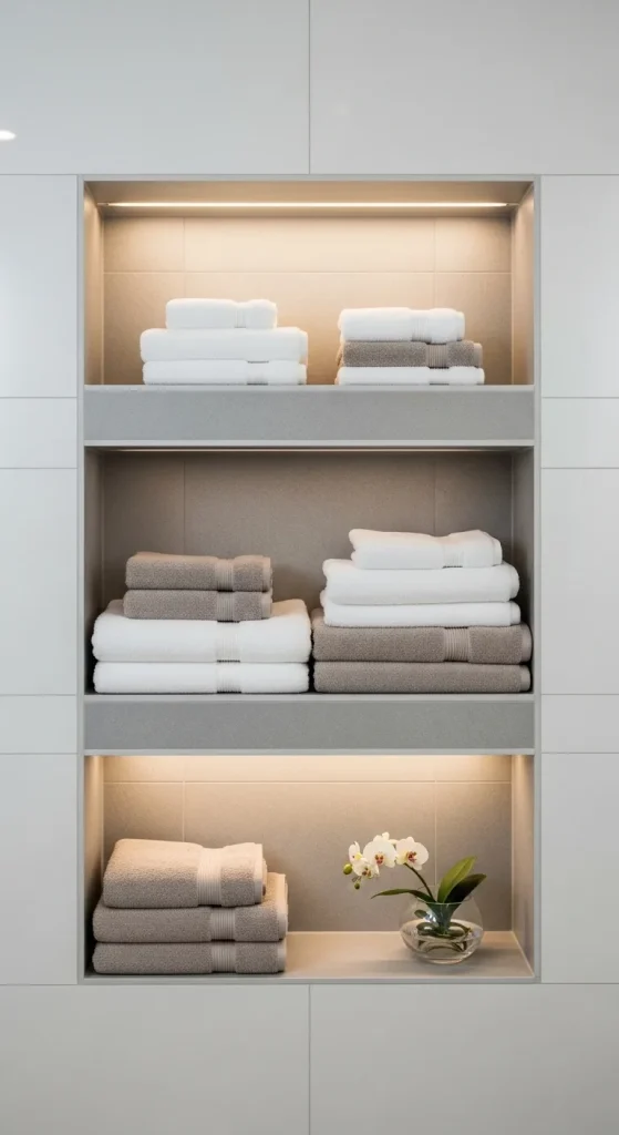 Recessed wall niche shelving integrates towel storage directly into the bathroom structure, creating a seamless and built-in appearance. This design is often used in modern construction or renovation projects where wall cavities can be utilized for storage purposes. The shelves sit flush within the wall, reducing visual clutter and maximizing space efficiency. This approach is highly effective for small bathrooms where external shelving may feel intrusive. It supports a minimalist style while maintaining high functionality and clean visual lines.