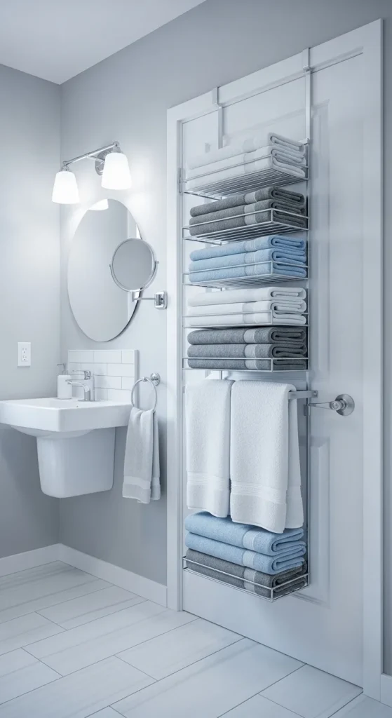 An over-the-door towel shelf rack is a highly practical storage solution designed for maximizing unused space behind bathroom doors. This concept is particularly useful for small bathrooms where wall space is limited. The structure typically includes multiple horizontal shelves or bars attached to a frame that hangs over the top of the door. Towels can be folded or rolled and placed on each level, ensuring easy access without taking up floor or wall space. This idea fits well within budget ideas and DIY organization strategies due to its simplicity and efficiency.