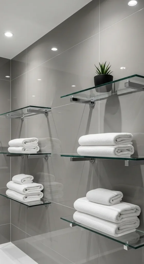 Glass and metal shelving introduces a sleek and modern storage option that enhances light reflection and visual openness in bathroom spaces. This design is commonly used in contemporary interiors where clean lines and minimalist aesthetics are prioritized. Glass shelves create a floating visual effect while metal brackets provide structural support. Towels stored on these shelves appear neatly displayed, contributing to a refined and organized environment. This setup works particularly well in bathrooms with modern design themes and neutral color palettes.
