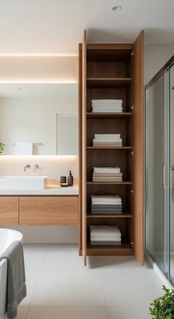 Built-in wooden cabinet shelving offers a concealed and highly organized towel storage solution. This design integrates shelving inside closed cabinet doors, maintaining a clean and uncluttered bathroom appearance. It is ideal for homeowners who prefer hidden storage rather than open display systems. The internal shelves can be customized based on towel size, allowing for efficient stacking and categorization. This approach aligns with structured home decor planning and long-term organization strategies.
