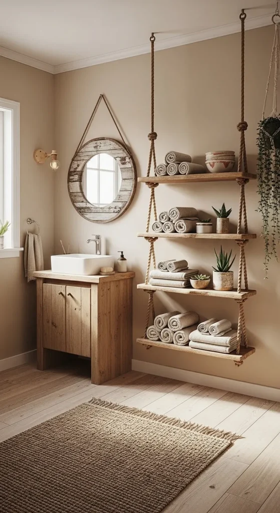 A rope and wood hanging shelf system introduces a creative and decorative approach to towel storage. This design combines wooden planks suspended by durable ropes, creating a floating shelf effect with a handmade aesthetic. It is often used in rustic or bohemian-inspired bathroom decor where natural materials are emphasized. The structure is lightweight yet functional, providing storage for rolled or folded towels while adding visual character to the space.