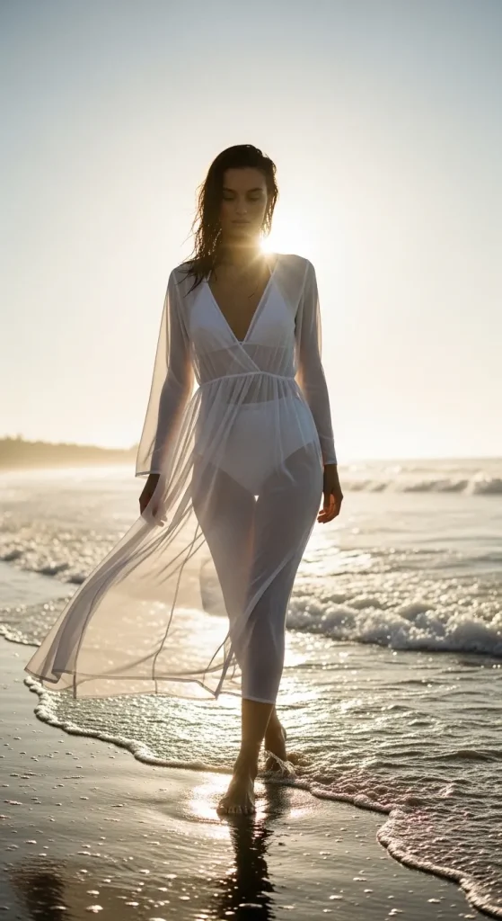 A sheer dress layered over a swimsuit creates a visually appealing and practical beach outfit. The transparency adds depth while maintaining coverage. This idea is widely used in aesthetic styling.