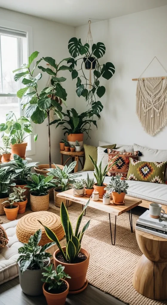 Indoor plants play a central role in boho living room ideas by introducing natural elements and improving overall ambiance. This concept focuses on incorporating greenery in a structured yet relaxed way. Plants add color variation, texture, and a sense of calm, making them essential for achieving a balanced aesthetic. Even low-maintenance plants can create a strong visual impact when arranged thoughtfully.