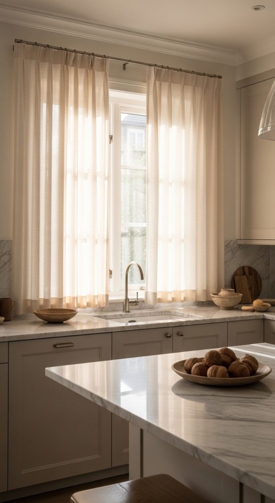 Sheer curtains remain one of the most elegant choices for kitchen windows. Their lightweight, translucent fabric allows sunlight to enter freely while softening its intensity. This creates a bright, welcoming environment without harsh glare.