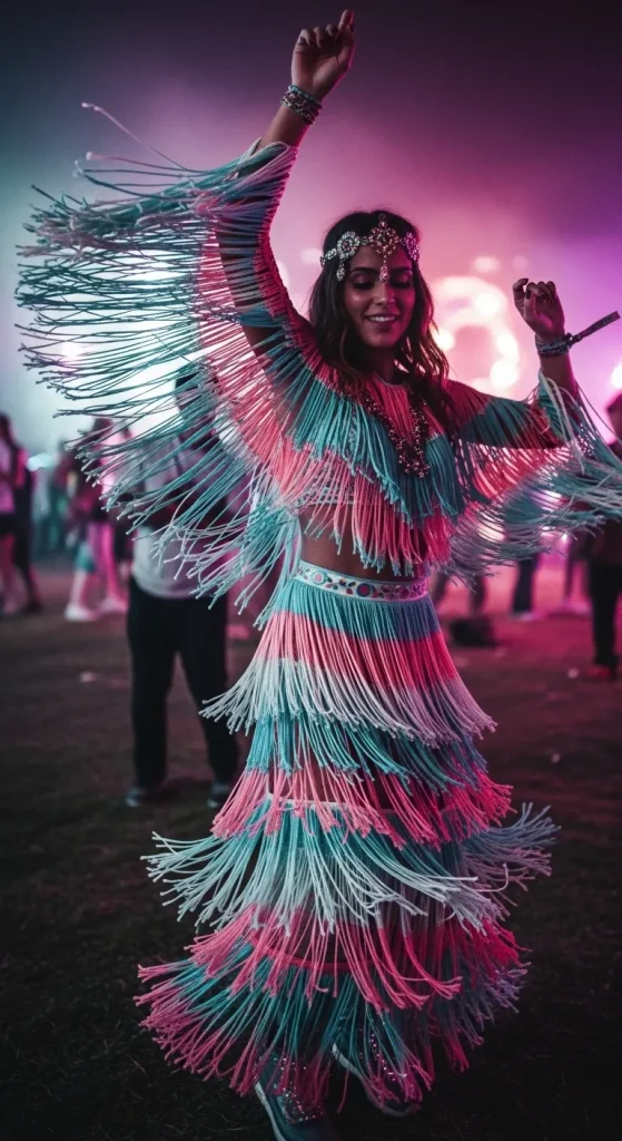 The fringe festival outfit incorporates movement into design. Fringe elements create dynamic motion, enhancing the overall visual effect during activity. This style is commonly used in rave fashion due to its ability to amplify movement and energy. It also aligns with aesthetic trends that emphasize texture and layering.