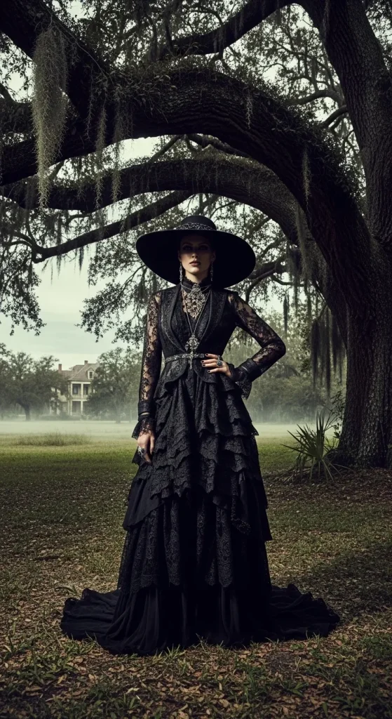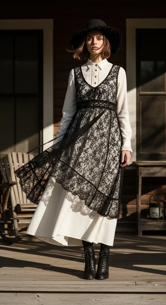 The layered lace dress is a core Southern Gothic fashion element that emphasizes texture and softness. This look uses a base dress made from cotton or linen, layered with lace overlays to create depth. The contrast between opaque and semi-transparent fabrics forms a visually balanced outfit. This idea aligns with Pinterest inspiration boards focused on romantic yet structured fashion.