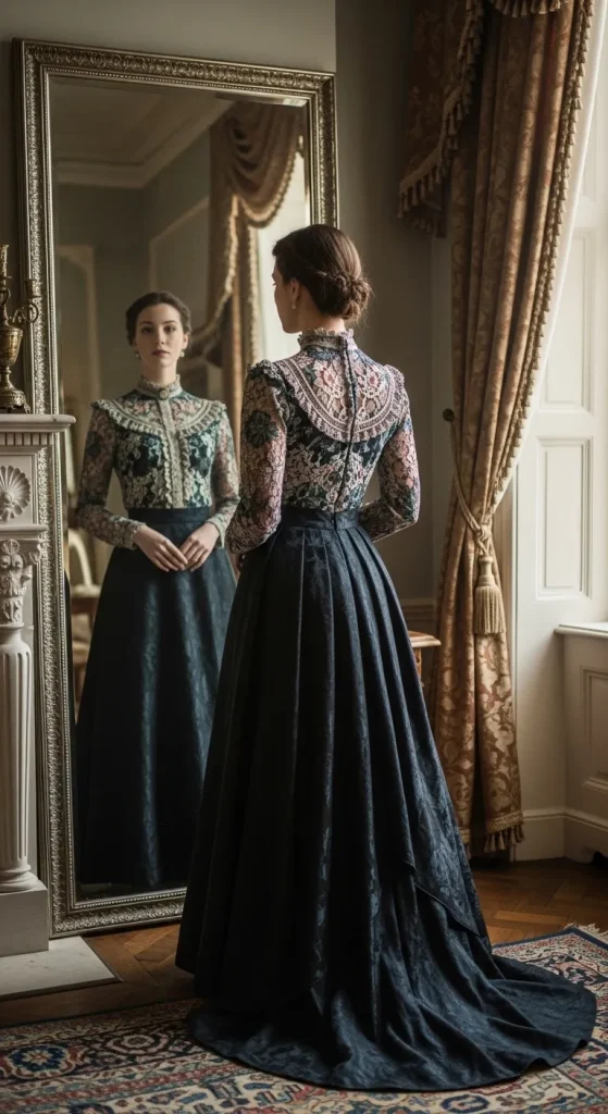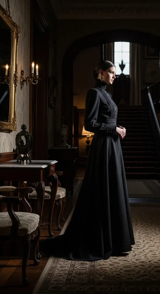 A vintage-inspired dark silhouette focuses on structured shapes and monochrome tones. This style uses long skirts, fitted tops, and high-neck designs to reflect historical influence. The emphasis is on clean lines and consistent color palettes, making it a strong example of modern design combined with traditional elements.