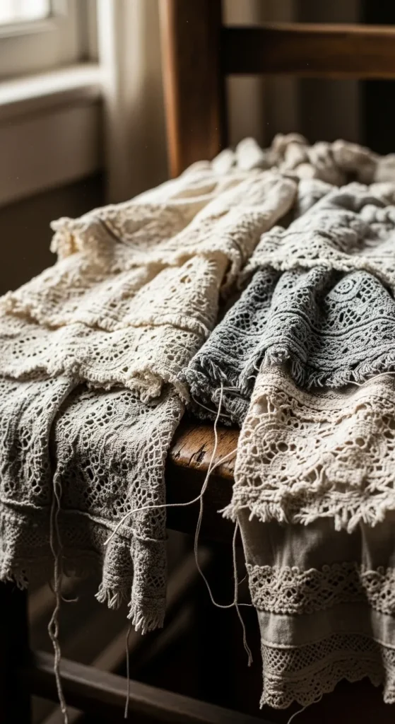 Distressed fabric layering introduces subtle imperfections that define the Southern Gothic aesthetic. This concept uses frayed edges, faded tones, and uneven textures to create a sense of age and character. It reflects the balance between elegance and decay, commonly seen in trending ideas across Pinterest.