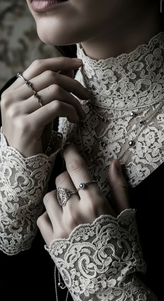Minimalist jewelry enhances Southern Gothic fashion without overpowering the outfit. Simple pieces such as thin chains or small rings maintain the aesthetic while adding subtle detail. This approach aligns with modern design and minimalist style principles.